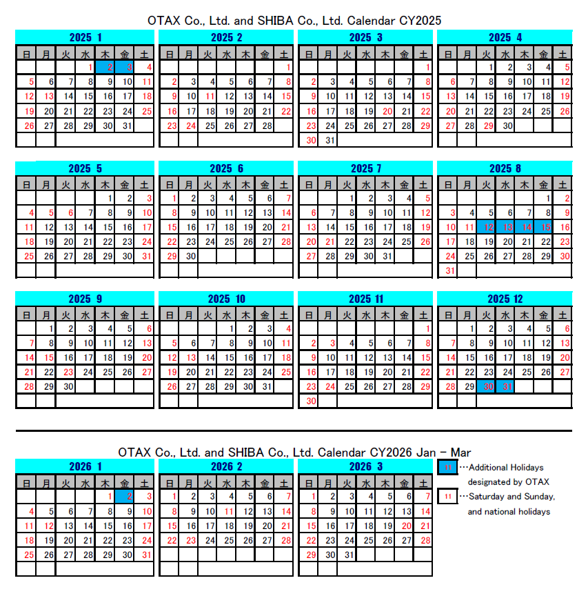 OTAX and SHIBA Business Calendar for FY2025 (Jan 2025 – Mar 2026)