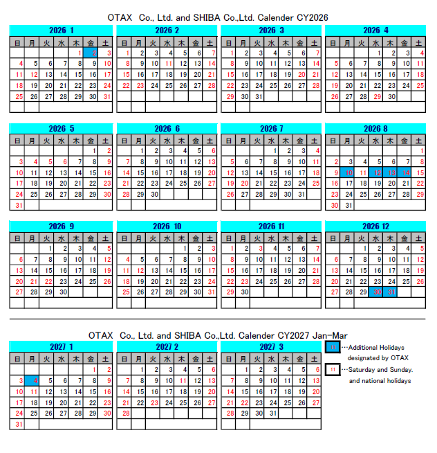 3. OTAX and SHIBA Business Calendar for FY2026 (Jan 2026 – Mar 2027)