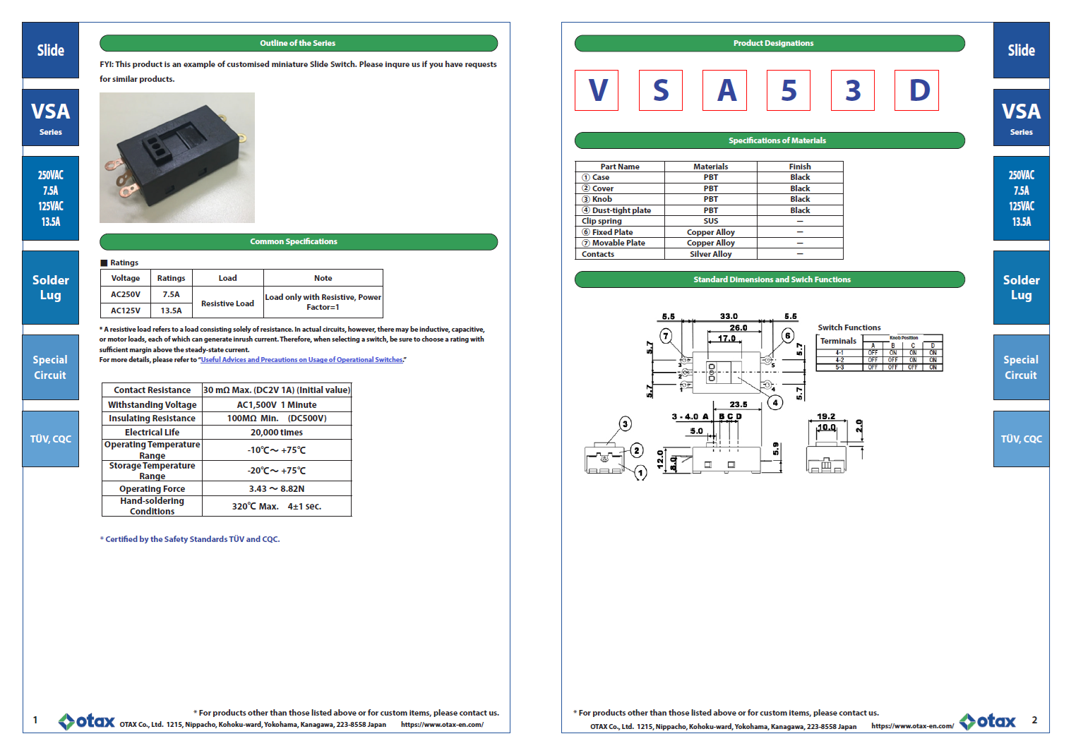 Operational Switches VSA Series Slide Here is a link for PDF file. The product introduced here is a custom product. If you are interested in similar products, please contact us. 3D CAD Download Series Product Name 3D CAD Remarks VSA VSA53D Miniature Slide Switch